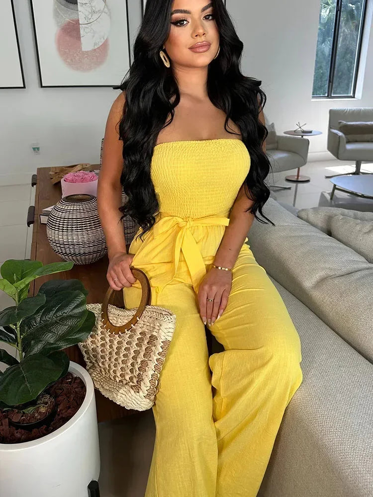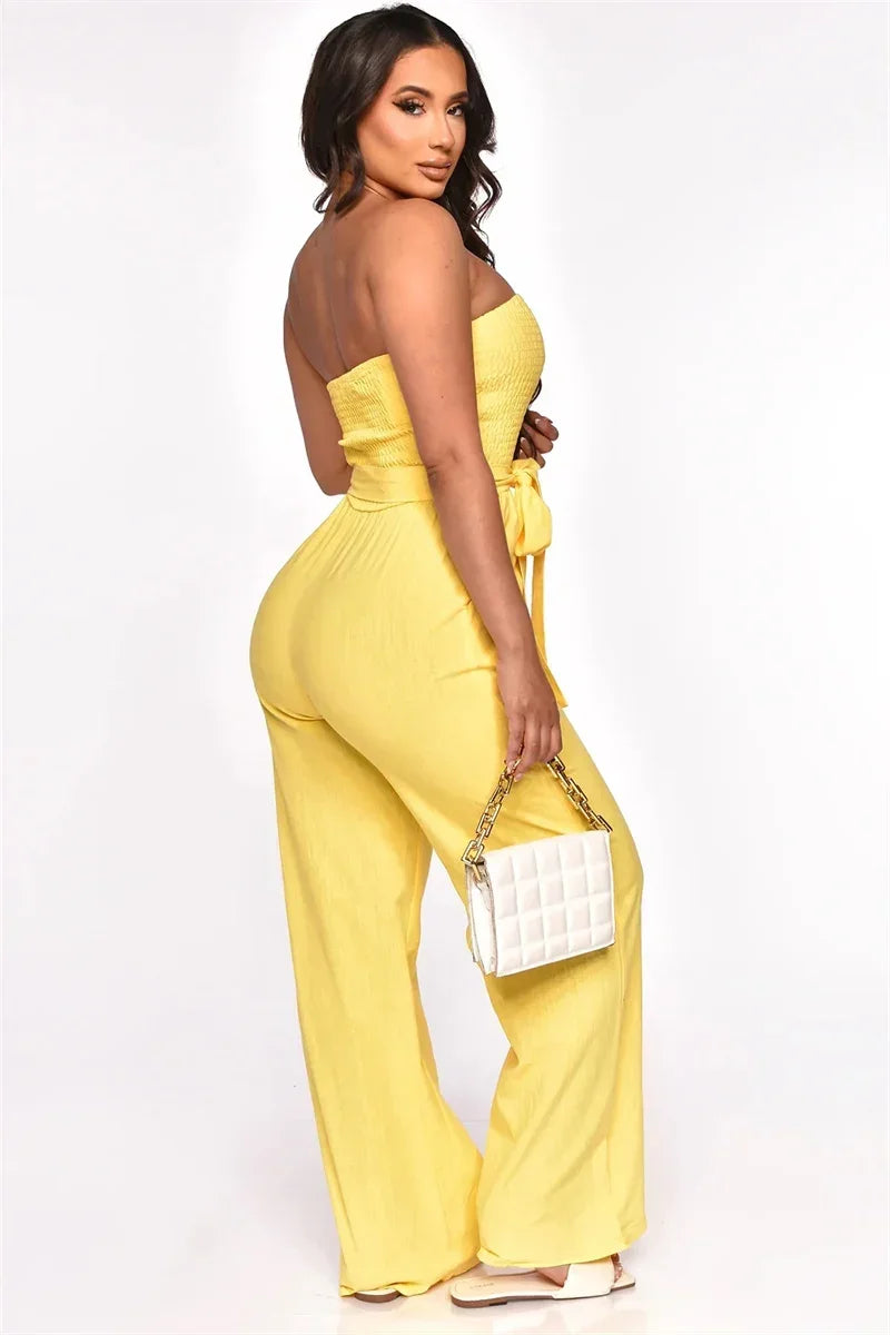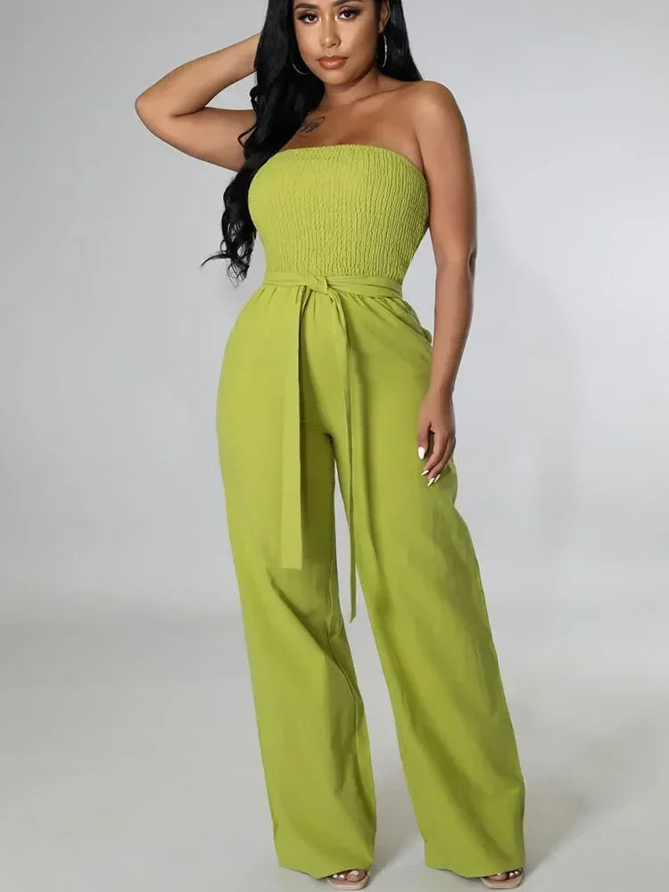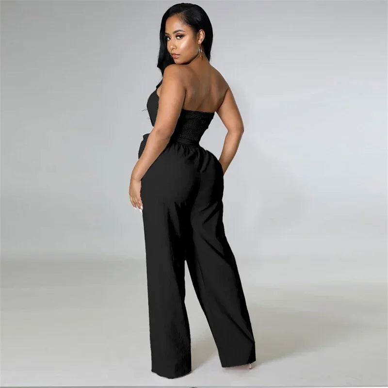 Crafted with precision, this dressy jumpsuit showcases a sleek strapless design topped with delicate ruffled lace, enhancing its elegant aura. The straight trousers flow into a flattering wide-leg silhouette, ideal for various body types. Accentuated with a lace-up detail at the back, it provides both style and adjustable comfort.