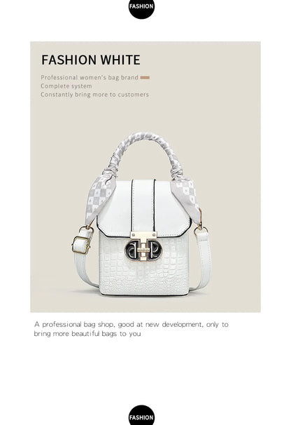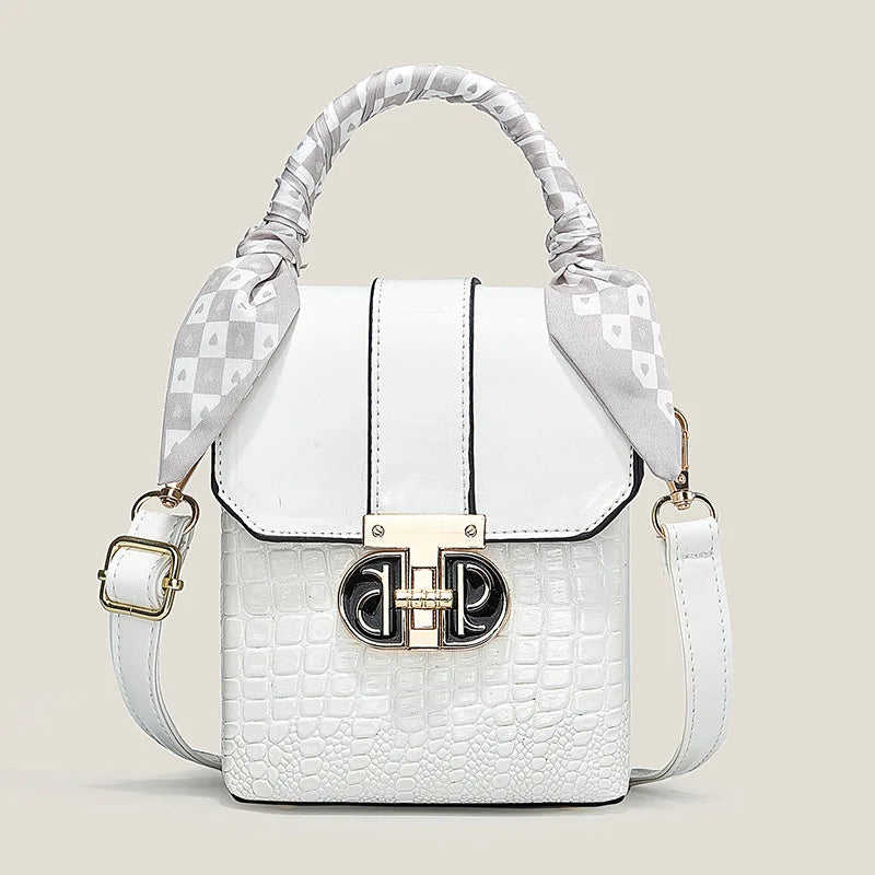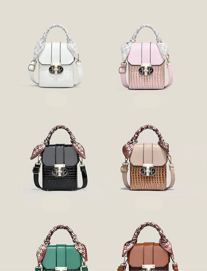 Crafted from premium PU material with a soft yet structured silhouette, this women's shoulder bag features an eye-catching contrast between smooth leather-look panels and textured crocodile-embossed sections. The signature decorative scarf handle adds a playful designer touch while maintaining the bag's refined aesthetic.