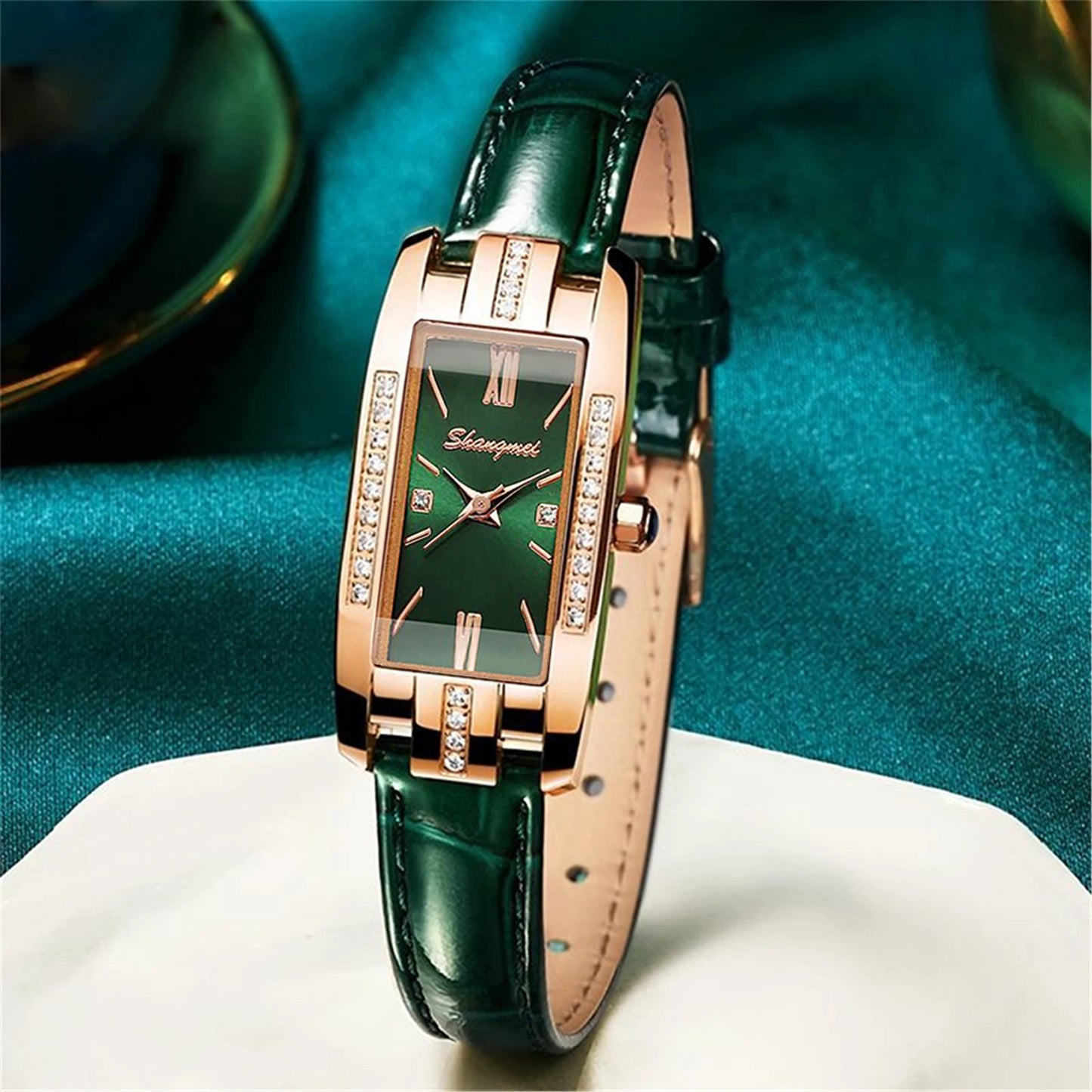 Crafted with meticulous attention to detail, this analog quartz wristwatch showcases a rich colored dial (available in emerald green, deep burgundy, and classic white) complemented by a supple leather strap that ensures all-day comfort. The rose gold-toned case adds a touch of luxury that makes this piece ideal for both casual weekend style and formal occasions.