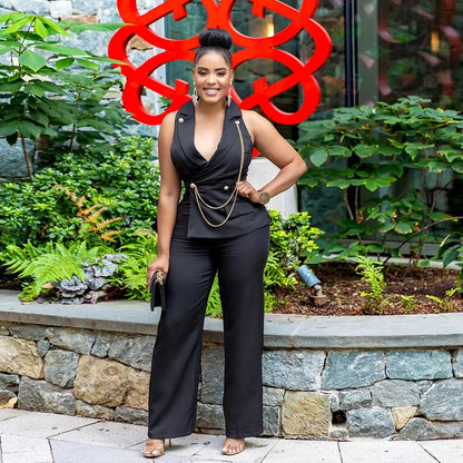 The integrated chain detail adds a touch of streetwear edge, perfect for those who dare to stand out. This trendy women's jumpsuit for sale not only captivates but caters to practical needs with its blend of style and substance. Whether stepping into a boardroom or strutting on a street in New York, it’s crafted to command attention.