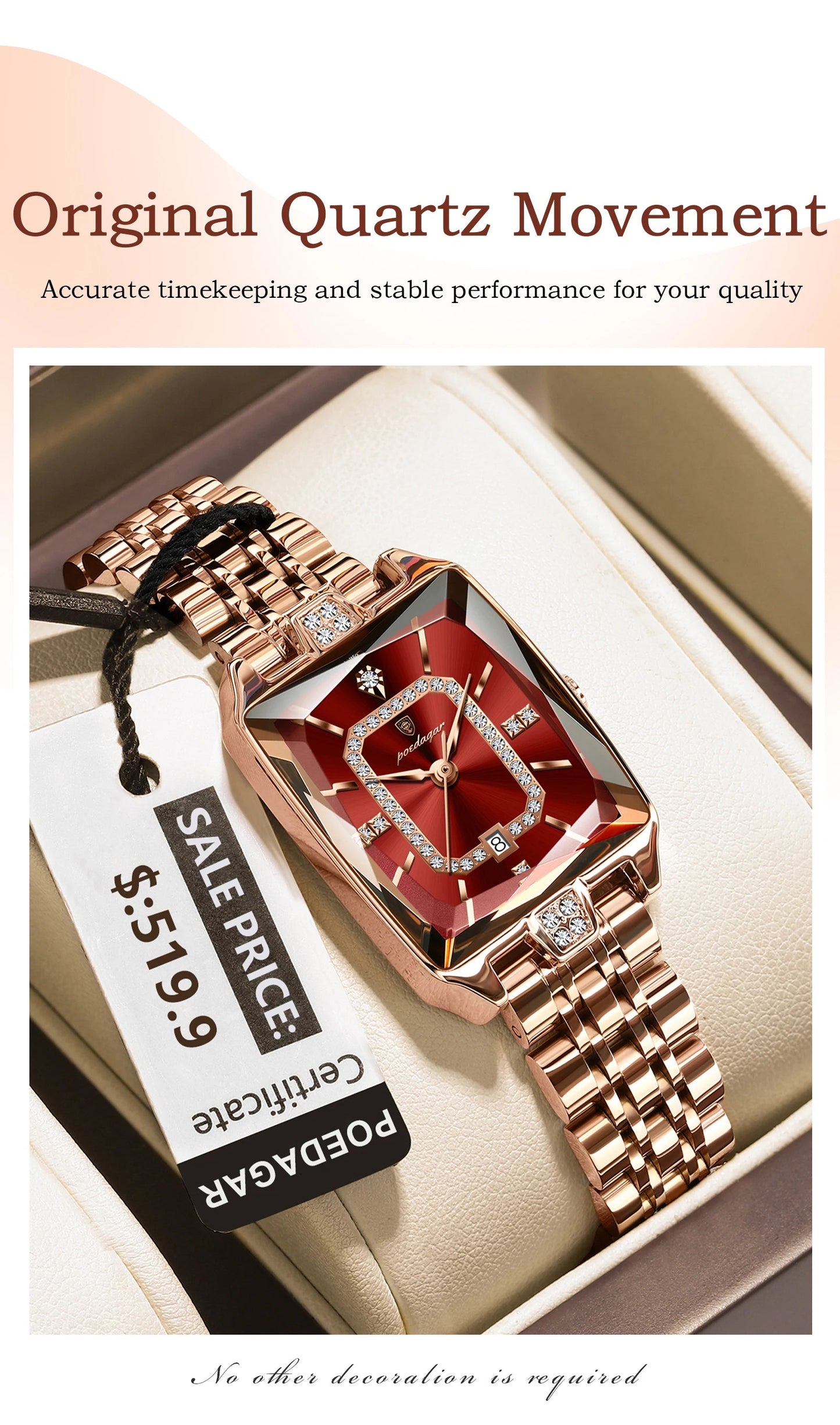 The stunning rose gold stainless steel construction ensures this durable stainless steel women's watch will maintain its lustrous finish through years of wear. With its sophisticated rectangle dial design and crystal-adorned accents, this timepiece represents the perfect fusion of contemporary style and classic refinement.