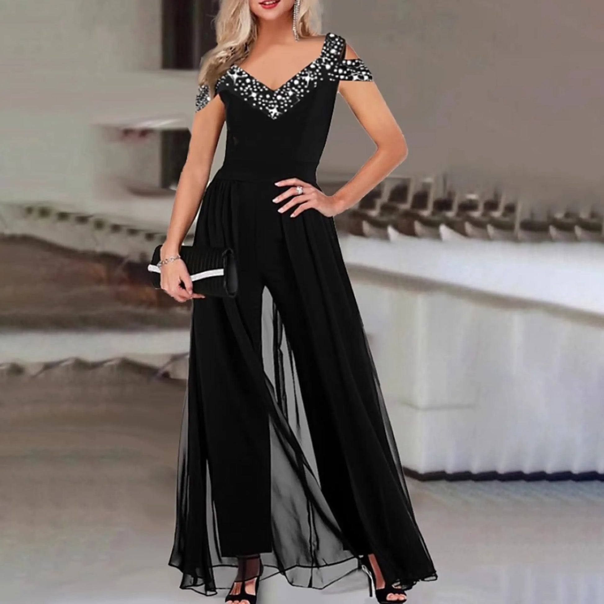 Elevate your wardrobe with our elegant V-neck sleeveless black jumpsuit, a perfect blend of sophistication and versatility. This dressy jumpsuit is ideal for formal occasions, church events, or as a chic alternative to traditional dresses.