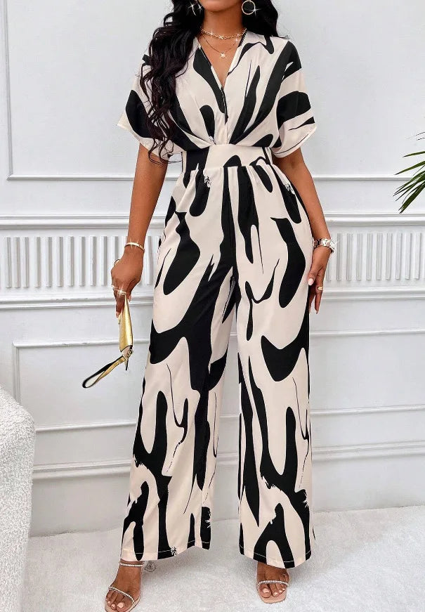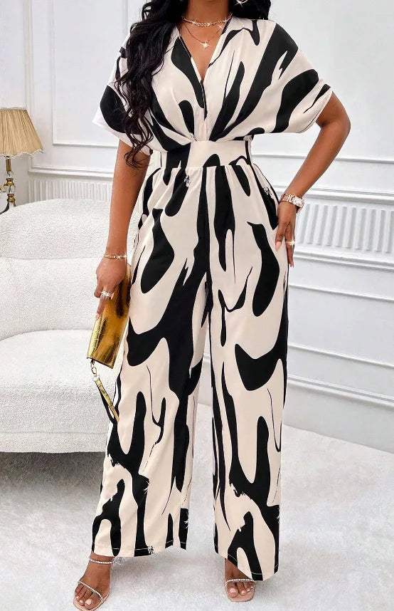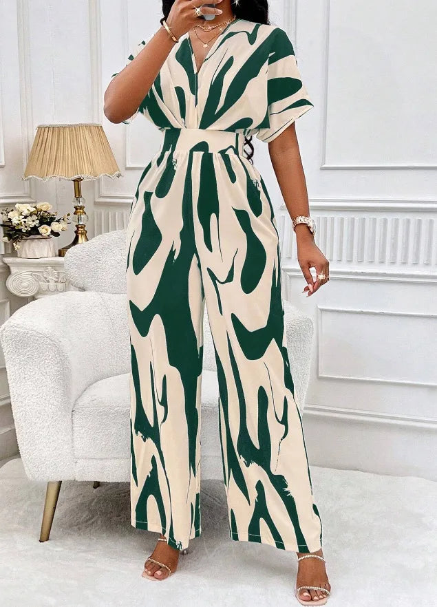 Elevate your fashion game with this V-neck Elegant Printed Batwing Short Sleeve Jumpsuit, a must-have for stylish women seeking sophistication and comfort. Designed with a flattering V-neckline, airy batwing short sleeves, and a cinched waist, this wide-leg jumpsuit offers an effortlessly chic silhouette.