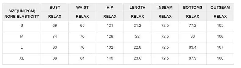Table displaying clothing size chart with measurements for bust, waist, hip, length, inseam, and outseam.