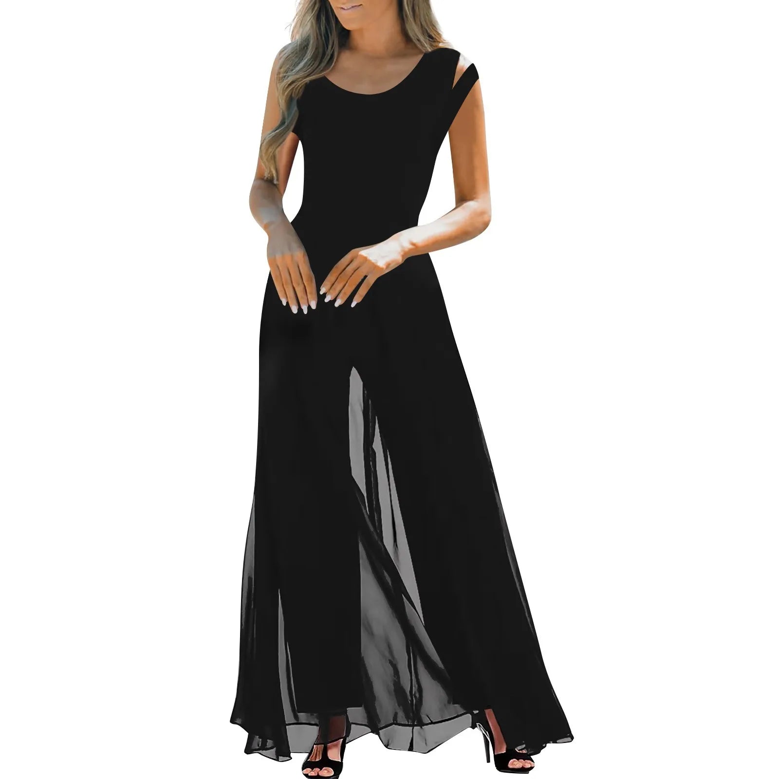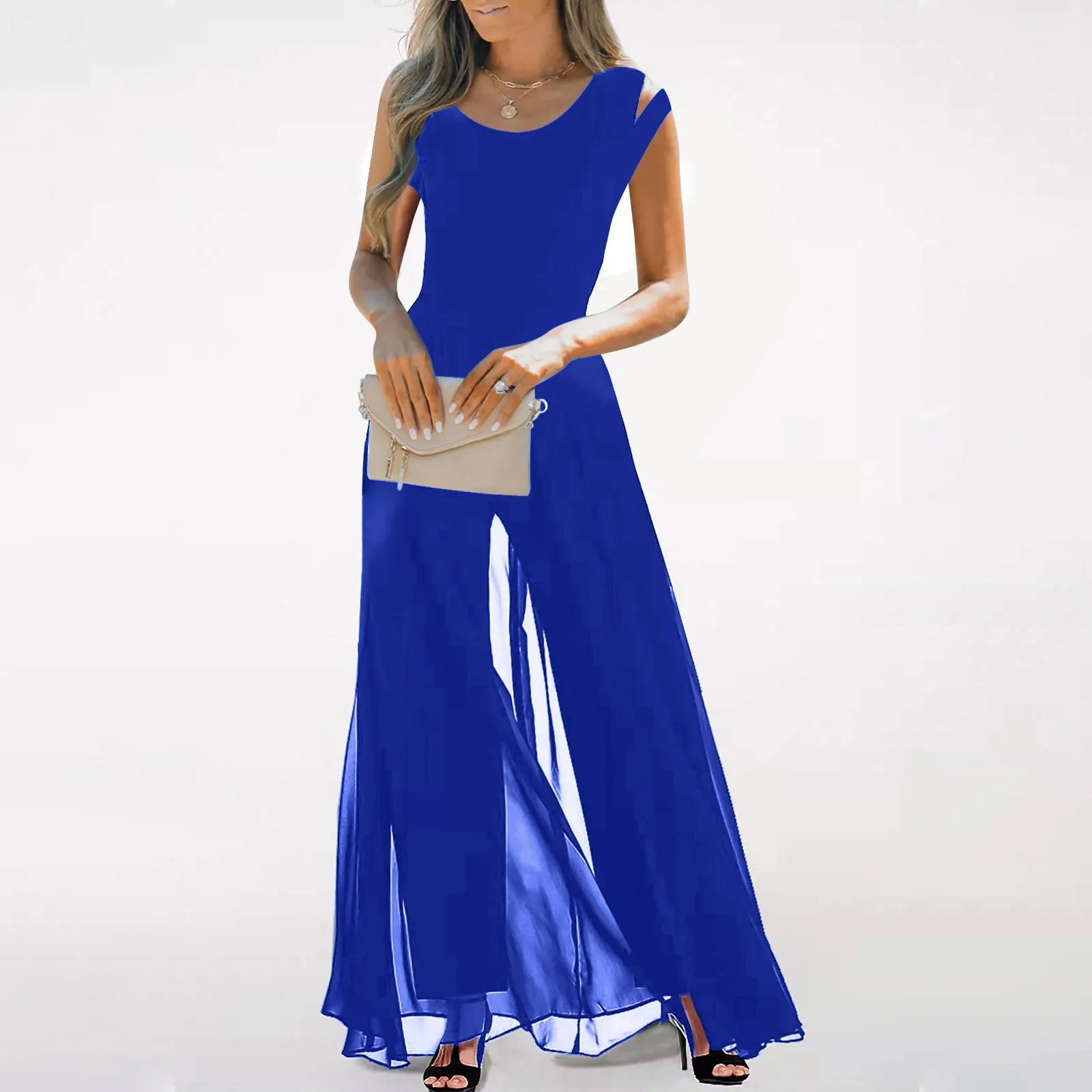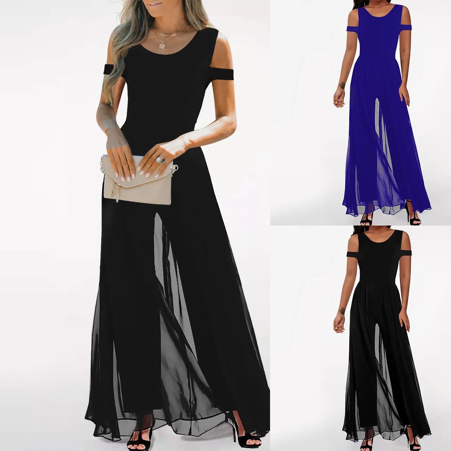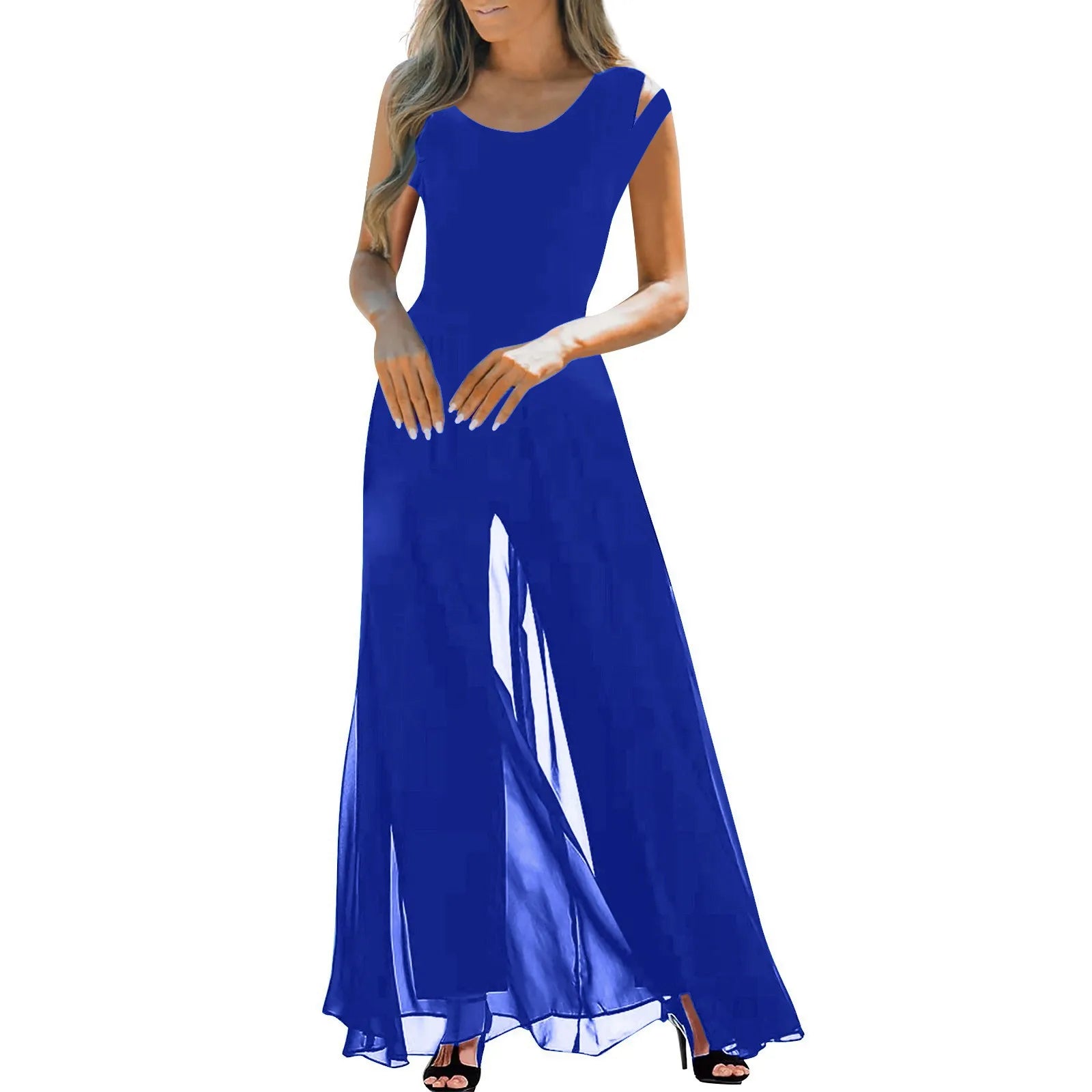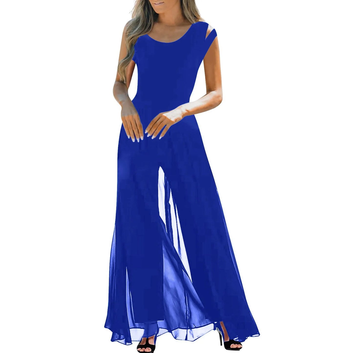 Crafted from lightweight chiffon, this dressy jumpsuit for women features cold shoulder cutouts, a scoop neckline, and a sheer layered overlay that floats beautifully with every step. Perfect for special occasions or whenever you want to elevate your look while staying cool and confident.