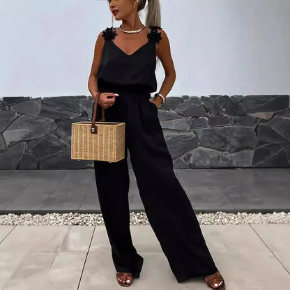 Step into summer with confidence wearing our trendy sleeveless jumpsuit – the perfect blend of comfort and style that every fashion-forward woman needs in her wardrobe. This classy wide leg jumpsuit features a stunning bohemian design with floral shoulder straps that effortlessly elevates your casual summer look.