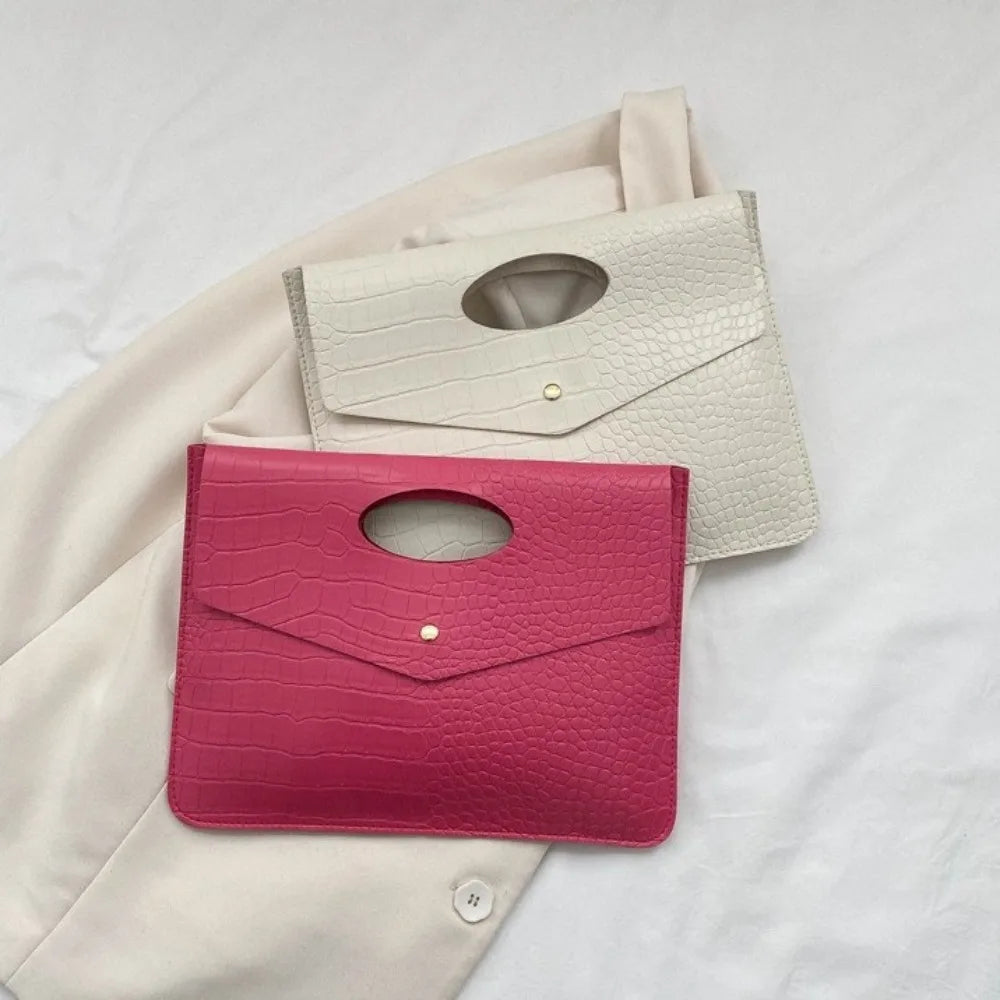 With a sleek envelope silhouette, cut-out oval handle, and secure snap-button closure, this bag offers handheld elegance that’s both eye-catching and practical. Available in vibrant hues—like bold blue, classy white, fuchsia pink, and more—this clutch transitions effortlessly from day to night, office to after-party.