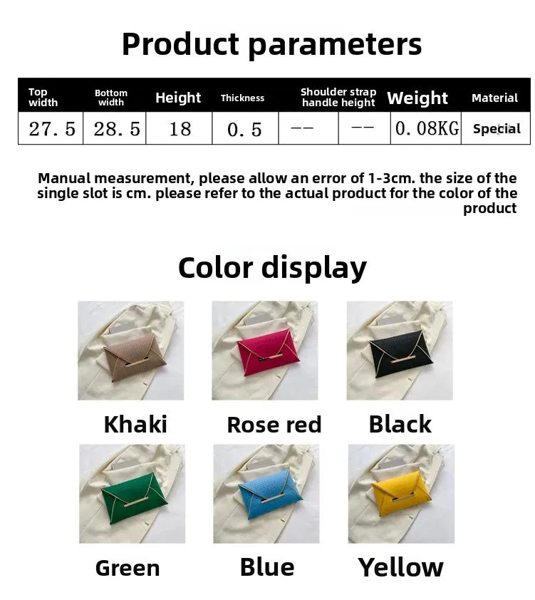 Crafted with precision, our clutch features a large capacity interior perfect for essentials. Available in eye-catching yellow, bold pink, classic black, deep green, and vibrant blue, each bag is designed to make a statement while providing practical usability. The embossed exterior not only adds an element of sophistication but also enhances durability.