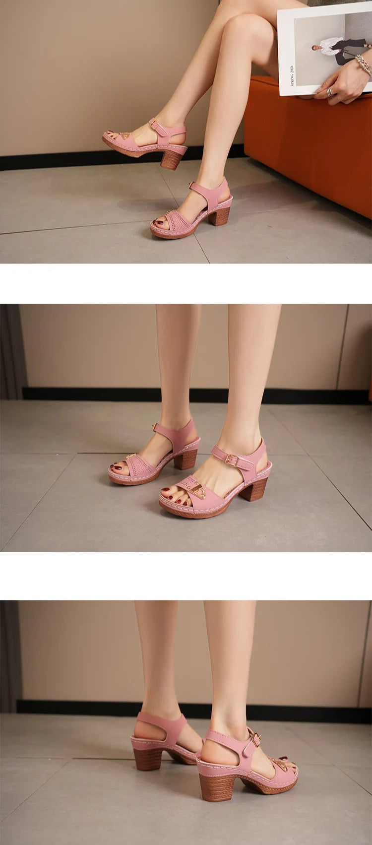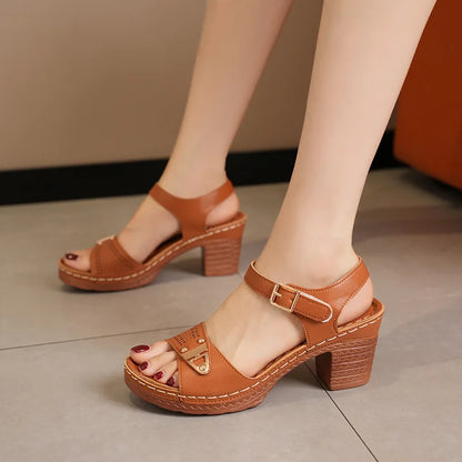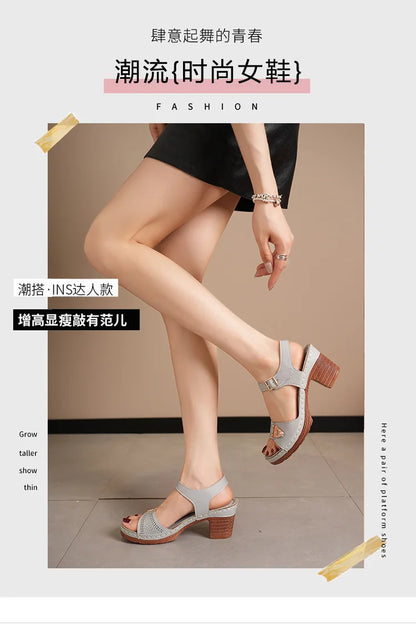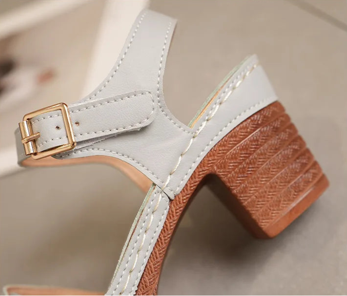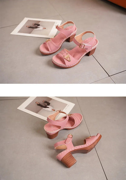 Women's Thick Medium Heel Adjustable Strap Solid Color One Line Fashion Sandals